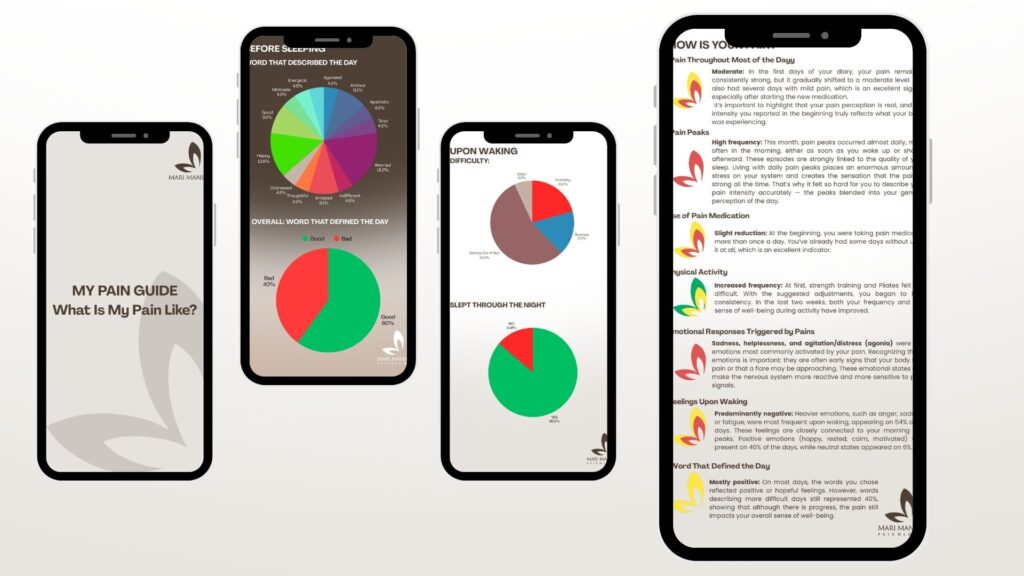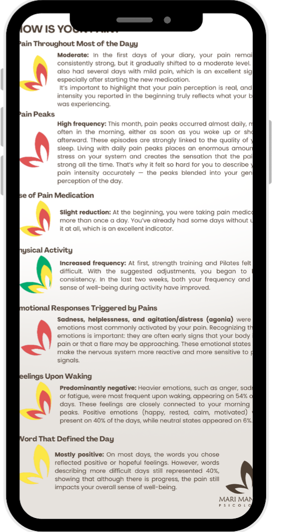 Developed by Mari Mansur, a brazilian pain psychologist, trained at Harvard and Albert Einstein Hospital, the Pain Guide translates what you feel into meaningful clinical information, revealing what no exam can show: how, when, and why your pain truly happens.