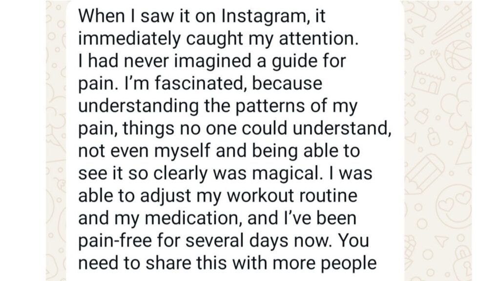 The Pain Guide was designed exactly for this: to help you map your pain behavior, identify triggers, patterns, timing, emotional associations, and even the factors that support improvement.